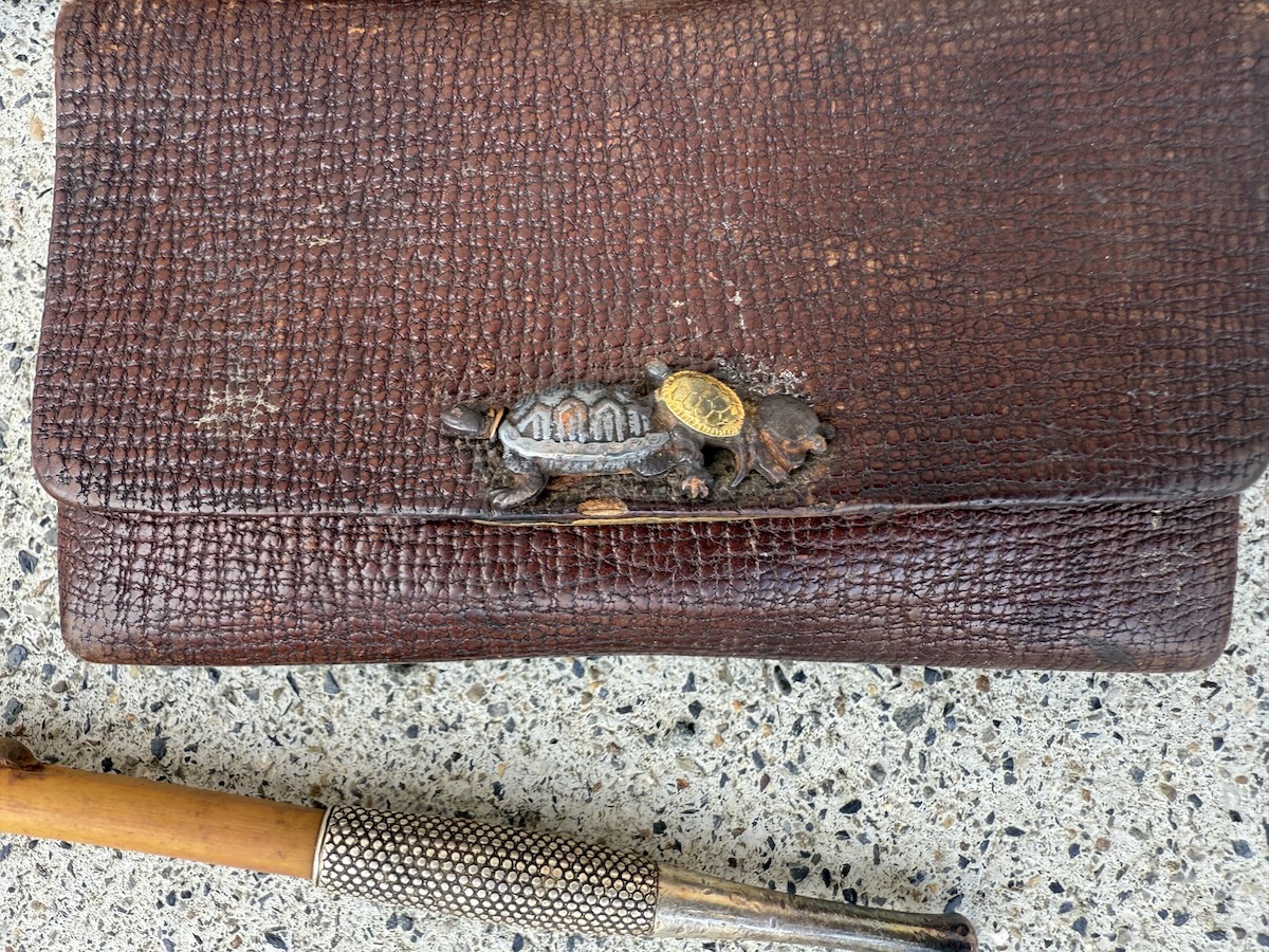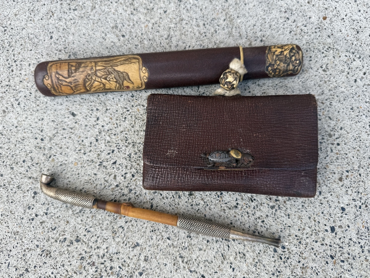 画像にてご紹介のお品は、精緻な彫刻が施された煙管筒(きせるづつ)と銀製の煙管(きせる)、そして革製のたばこ入れ(提物)の3点セットです。