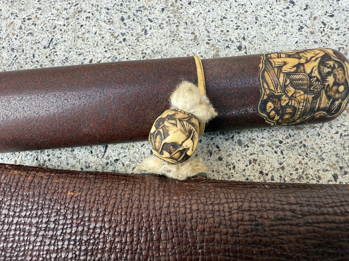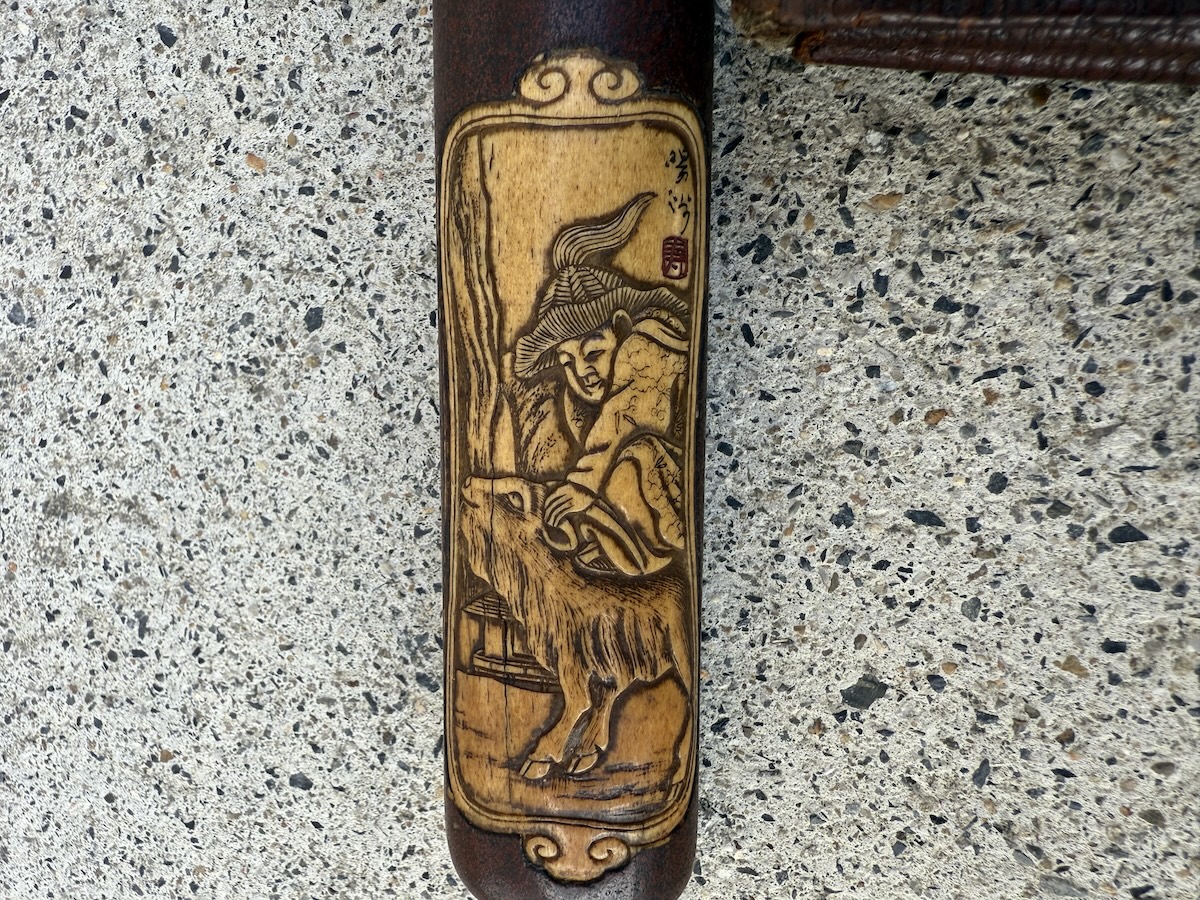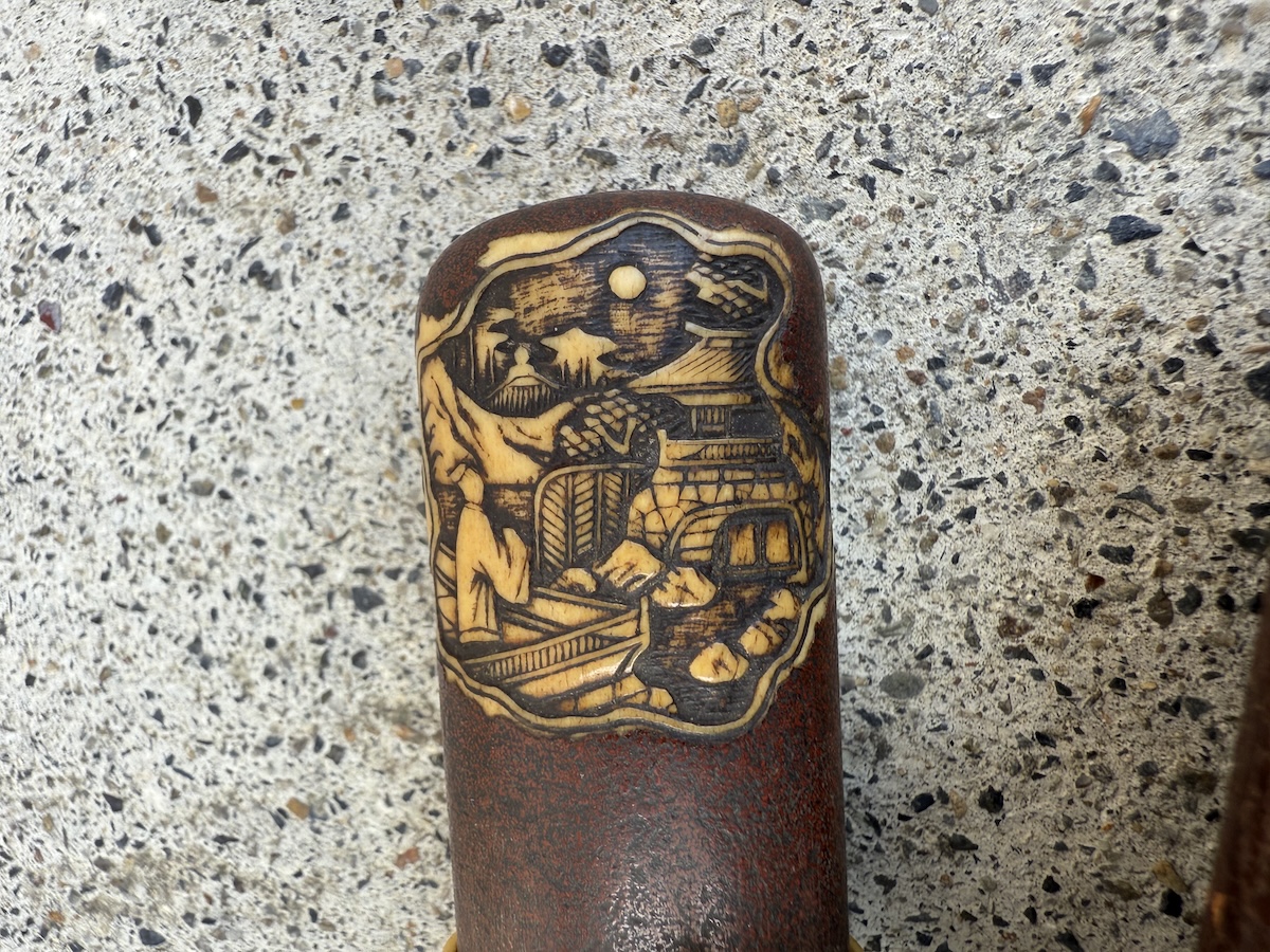 煙管筒には風景と人物が繊細に彫り込まれ、印銘(在名)も確認できることから、職人による手彫りの逸品と見られます。